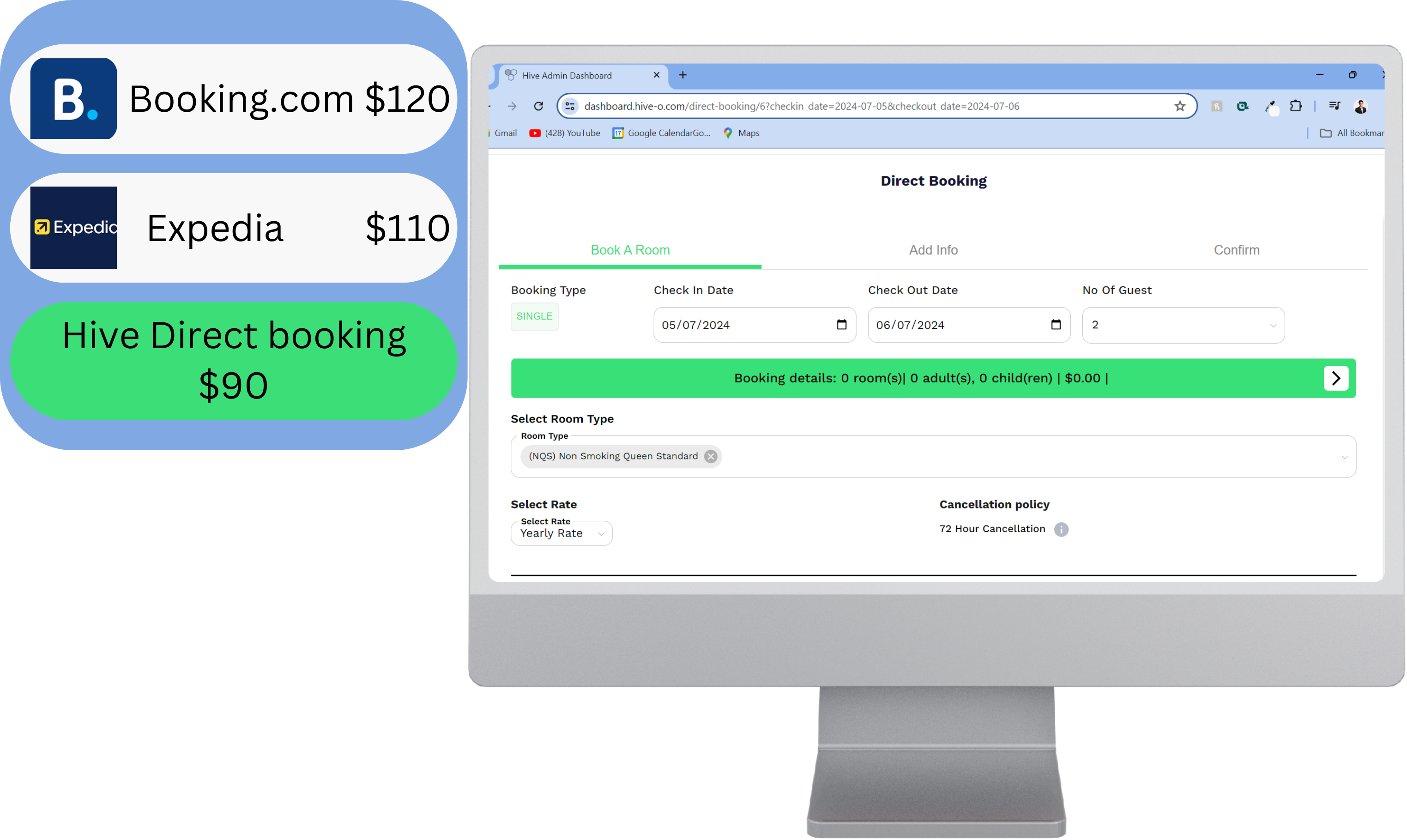 With Hive’s direct booking engine, customers can effortlessly book their stays directly through your website at the best available prices. This not only simplifies the booking process but also helps you save on costs associated with OTAs.
